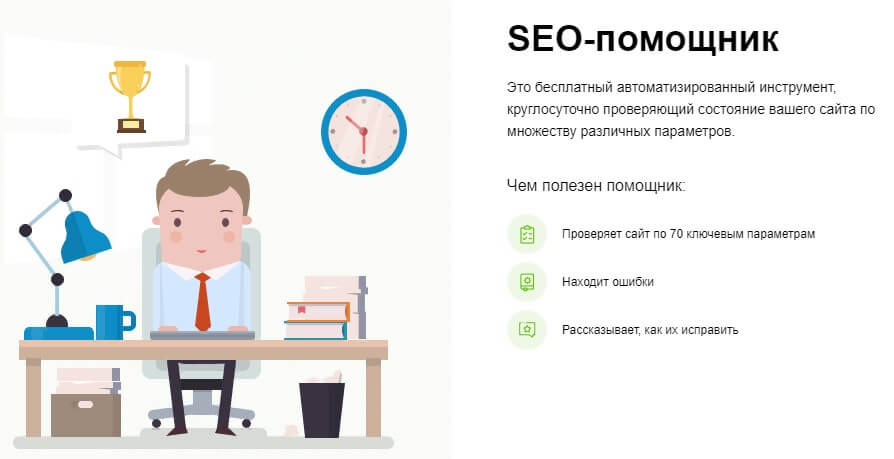 Всем активным пользователям доступен бесплатный автоматизированный ассистент — SEO-помощник. Инструмент, который круглосуточно проверяет состояние сайтов по 70 параметрам, тем самым экономя время владельцев ресурсов на аудиты. SEO-помощник своевременно сигнализирует, как и когда исправлять ошибки и вносить изменения на сайте, тем самым ускорив процесс его продвижения.
