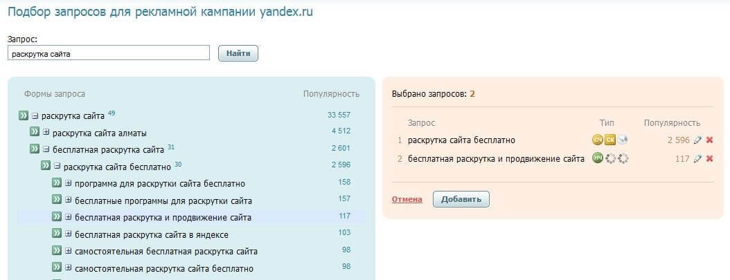 Включайте наиболее интересные ключевые фразы в список продвигаемых. После нажатия кнопки “Добавить” выбранные запросы будут доступны на странице “Управление рекламной кампанией”.
