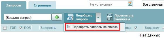 После создания проекта нажмите кнопку “Подобрать запросы” и выберите в выпадающем списке “Подобрать запросы из списка”.