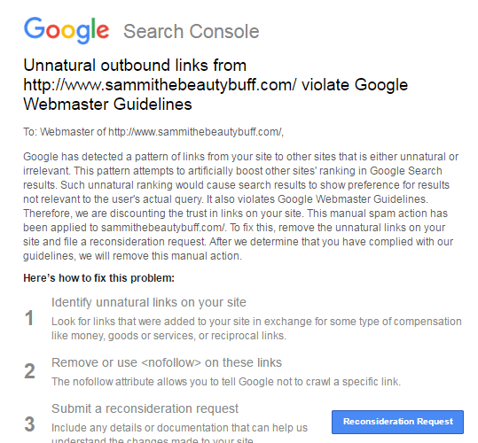 Кстати, сайт, указанный на скриншоте уведомления Google, является именно блогом бьюти-тематики - www.sammithebeautybuff.com.