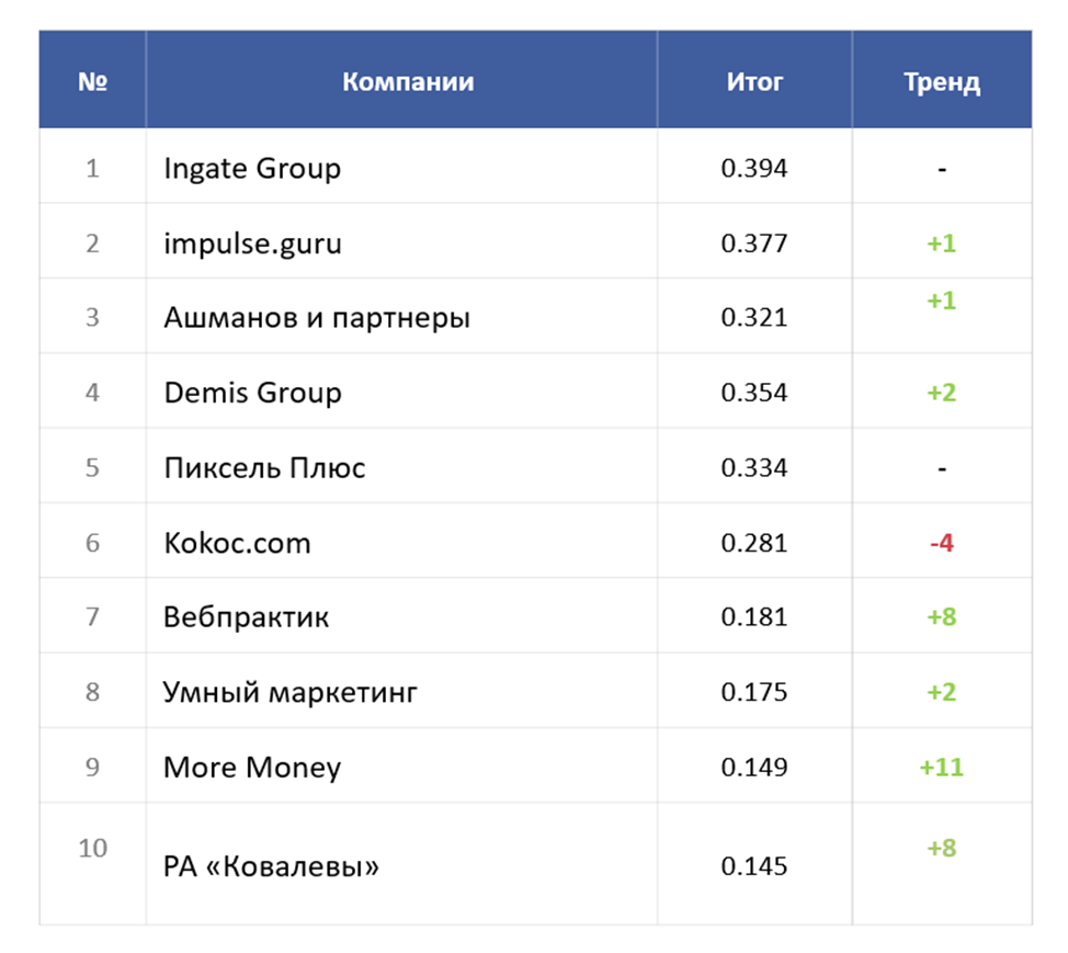 Победителем рейтинга в 2025 году стала Ingate Group, усилившая лидерство за счет высоких экспертных оценок респондентов. Вторую позицию занимает impulse.guru. Компания «Ашманов и партнеры» поднялось на одну строчку, замкнув тройку лидеров.