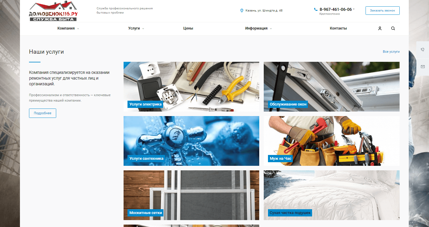 Первое, что сделали наши специалисты с сайтом бытовой службы Domovenok — продумали новую логичную и удобную структуру сайта. Избавились от корзины, которая в этой тематике абсолютно некорректна и только отвлекает пользователей, объединили страницы услуг и товаров в один большой раздел, добавили предложения сопутствующих товаров каждой услуге. Продумали механику заказа “в одном окне”, например, нужного специалиста и детали, с предварительным расчетом, в какую сумму обойдется починка.