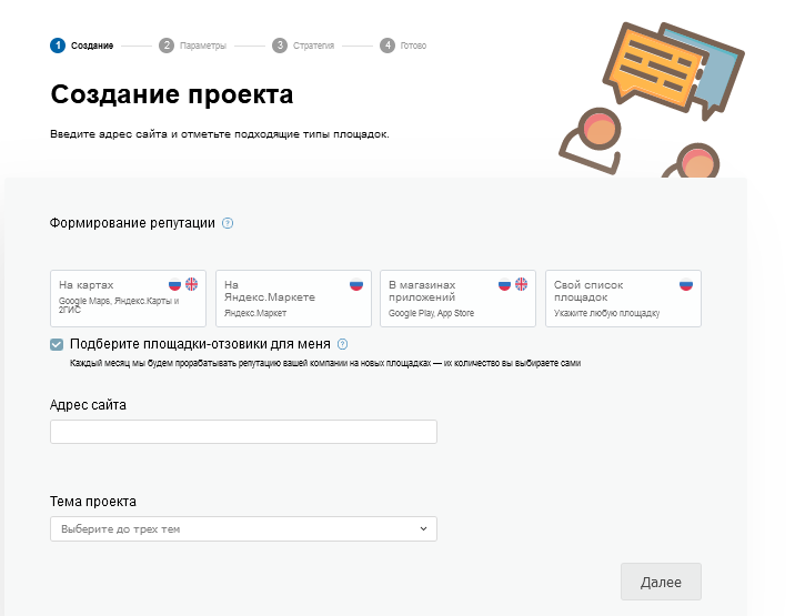 Вы можете собрать целый список своих площадок, на которых вашей компании требуется формирование репутации. Добавляйте эти площадки, а мы проверим возможность работы на них.