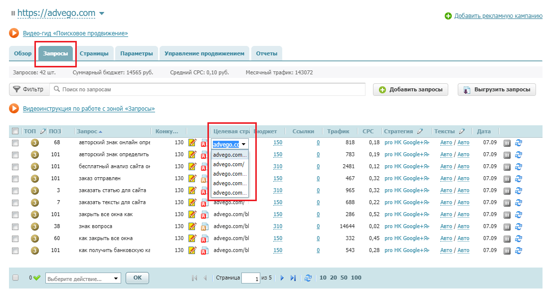 На вкладке «Запросы» нажмите на адрес целевой страницы в соответствующем столбце, как показано на картинке.