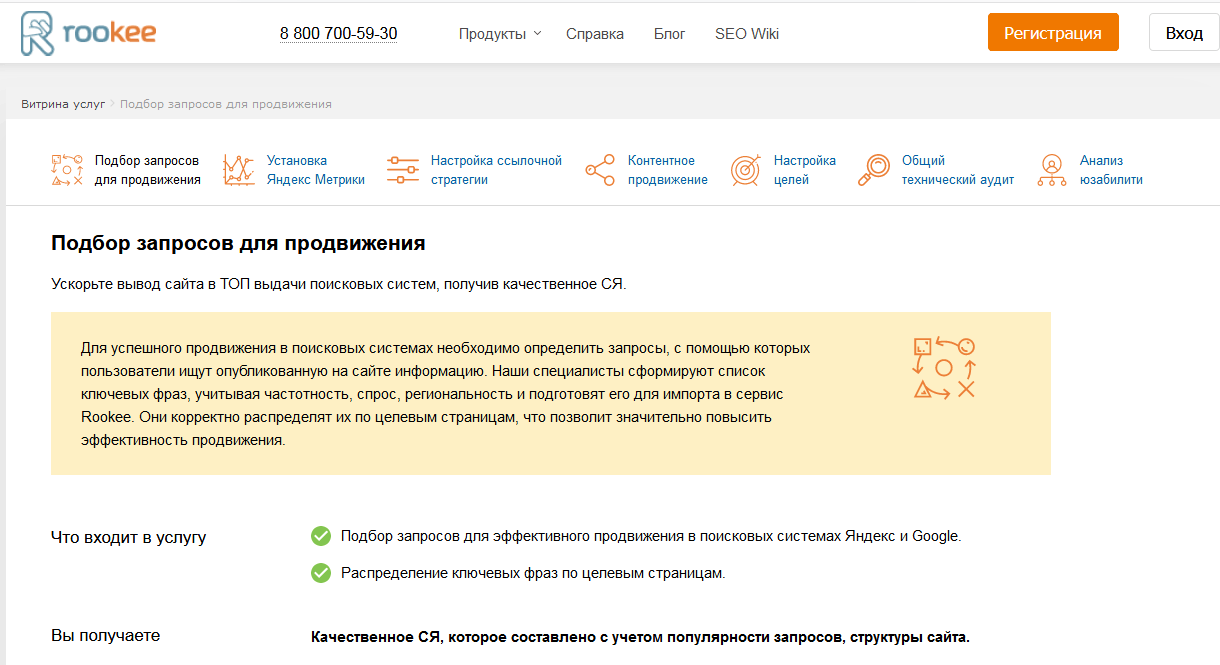 Для более скрупулезного анализа конкурентов, подбора запросов и кластеризации (группировки) ключей по страницам вашего ресурса, есть возможность заказать семантическое ядро у экспертов Rookee в разделе Витрина услуг.