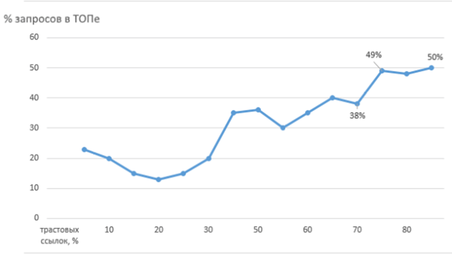 Специалисты Rookee провели исследование более чем на 100 проектов разной тематики и доказали это. На сайтах, вошедших в выборку, обычные ссылки постепенно замещались ссылками, прошедшими проверку CheckTrust (трастовыми). Оценивалась доля запросов в топе. В результате было доказано, что средняя позиция сайта по основным запросам по мере замещения обычных ссылок трастовыми растет: