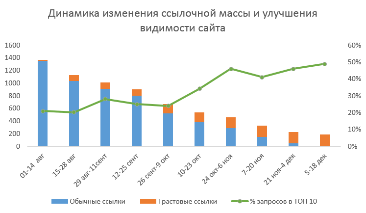 Трастовые ссылки начали размещаться в начале августа. При этом параллельно с закупкой трастовых ссылок снимались обычные, чтобы оптимизировать бюджет на продвижение и улучшить ссылочный профиль.