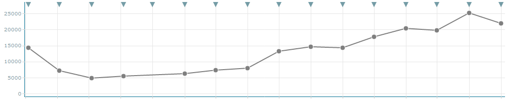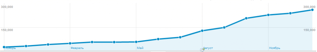 Сайт продвигался по большому числу запросов (более 10 000). С помощью сервиса ROOKEE удалось достичь ТОПа по 60% из них. Другая часть запросов достигла ТОПа без использования ссылок, только за счет внутренней оптимизации и перелинковки. Больший упор делался на максимальный охват аудитории и привлечение наибольшего количества посетителей, чего и удалось достичь. Как повышался месячный трафик, видно на графике: