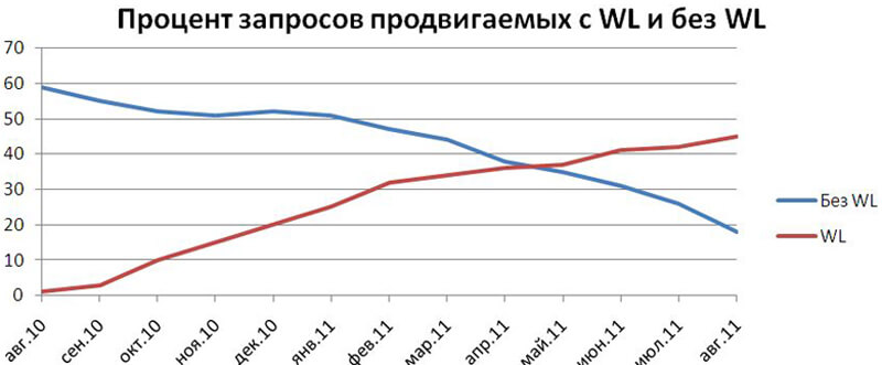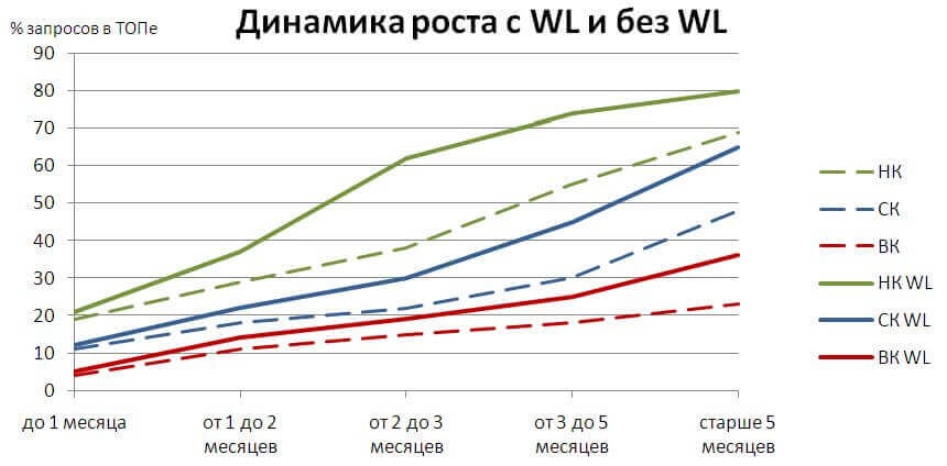 Не зависимо от популярности запроса, динамика роста его позиций с использованием в продвижении WL и без использования - значительно отличаются.