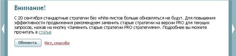 В связи с этими нововведениями в сервисе ROOKEE произошли некоторые изменения. С сегодняшнего дня стандартные стратегии без white- листов больше обновляться не будут. Для того, чтобы повысить качество продвижения ваших проектов, мы рекомендуем заменить ваши текущие стратегии на новые, с добавленными white- листами.