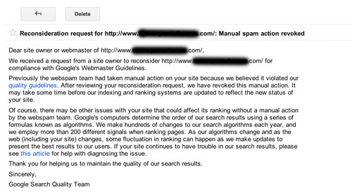 Неестественные ссылки: После того как вы подали на пересмотр, Google даст ответ в течение 3-14 дней. У меня один раз это заняло шесть недель, но это было сразу после того, как был выпущен инструмент отказа от ссылок, и, возможно, Google нужно было проверить много сайтов. Если вы получаете замечательное сообщение «Меры, принятые командой по борьбе со спамом, отменены», восстановление некоторых сайтов может произойти уже через пару дней. В зависимости от того насколько серьезными были санкции, времени может потребоваться значительно больше, вплоть до нескольких месяцев.