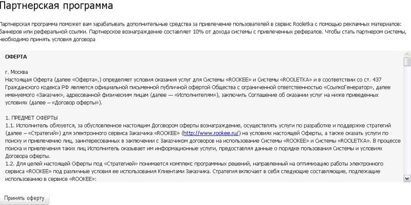 Если вы собираетесь стать партнером сервиса Rooletka, авторизуйтесь в системе, перейдите на область партнерской программы и ознакомьтесь с договором-офертой. Если вы согласны с ее условиями и подтверждаете свое согласие, вы становитесь партнером.