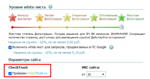 Обратите внимание, что Rookee покупают ссылки по этой технологии для запросов с бюджетом от 50 рублей. Если бюджет запроса меньше, площадки подбираются по правилам без фильтра «Проверено CheckTrust.ru».
