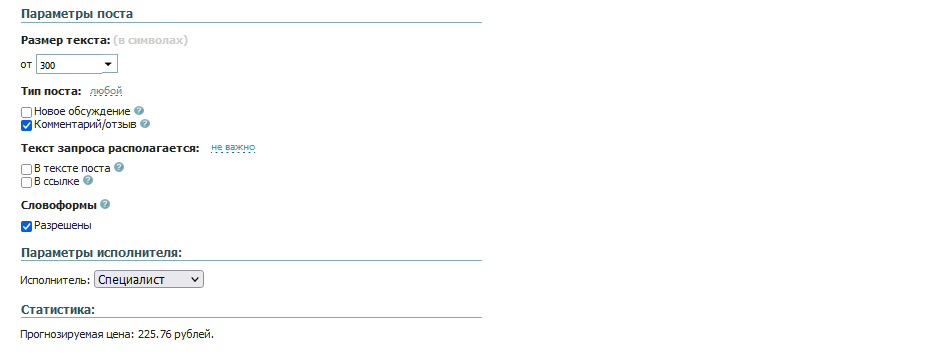 По умолчанию стратегия покупки крауд-ссылок подбирает форумы и сервисы вопросов и ответов с трафиком от 1000 посетителей в месяц. Минимальный размер поста — 300 символов.