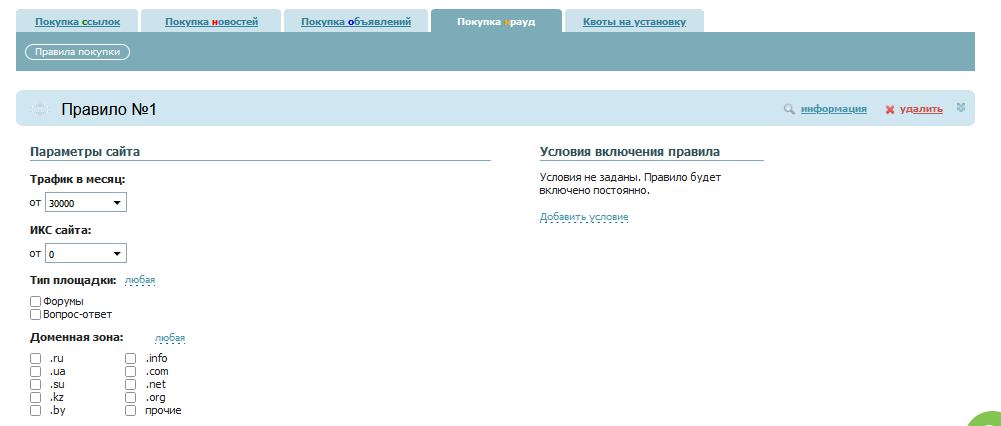 Покупкой крауд-ссылок управляет стратегия, которая используется для запроса. Она содержит параметры площадки, поста и исполнителя, прогнозируемую стоимость крауд-ссылки и квоты на установку. Параметры редактируются.