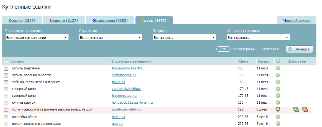 В столбце «Размещение» вы также увидите статус ссылки — подробнее о различных статусах ссылок можно прочитать в соответствующей статье нашей справки
