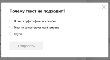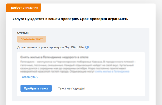 На рабочей зоне «Мои заказы» вы сможете одобрить или отклонить текст, указав причину.