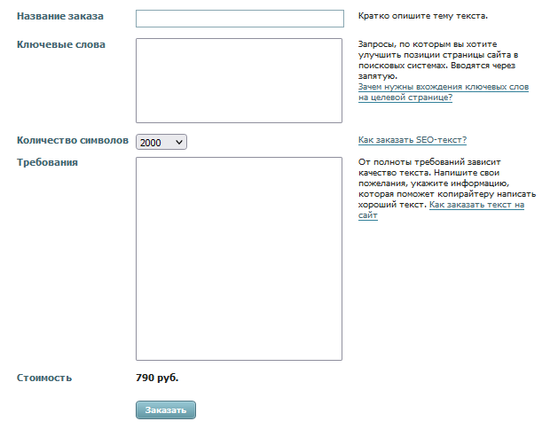 Заполните все поля, предложенные на открывшейся странице, чтобы копирайтер мог написать текст, максимально удовлетворяющий вашим требованиям.