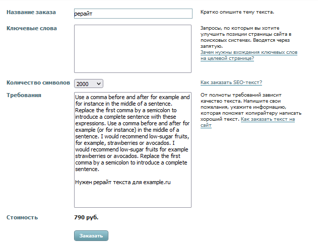 Рерайт текста можно заказать так же, как и обычный SEO-текст. Просто укажите, что вам нужен именно рерайт.