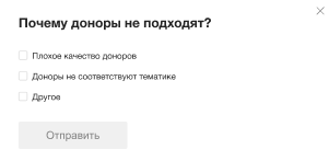 Или нажмите «Доноры не подходят». При клике откроется всплывающее окно, в котором вы сможете указать причину, по которой доноры вам не подходят.