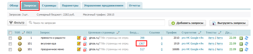 Перейдите на вкладку «Запросы». Здесь, в столбце «Бюджет», нажмите на числовое значение, соответствующее интересующему вас запросу.