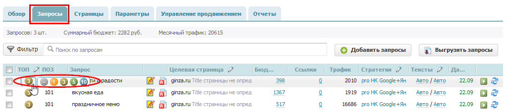 Выберите более высокую цель продвижения в колонке «Топ» у интересующего вас запроса, как показано на картинке.