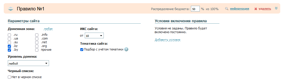 Кстати, в блоке «Статистика» указывается количество доступных с выбранными параметрами площадок и средняя стоимость размещения ссылки. Вы можете ориентироваться на эти значения, подбирая условия для правила.