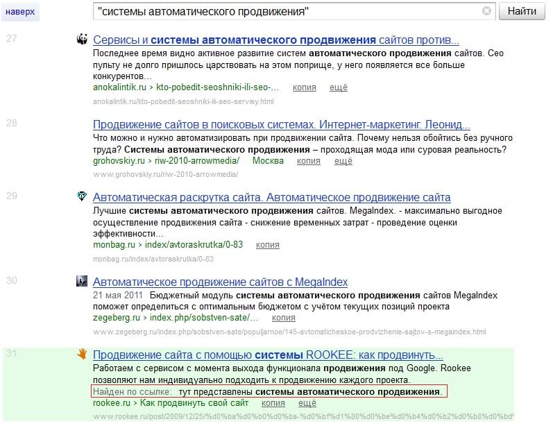 Спустя 26 дней с момента запуска автозакупки ссылок по данным запросам в индексе поисковой системы Яндекс оказалось 97 ссылок из 112. Минимальная длина безанкорного текста ссылки составляла 5 слов (включая ссылку и предлоги), максимальная длина – 12 слов (включая ссылку и предлоги).