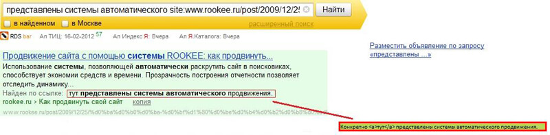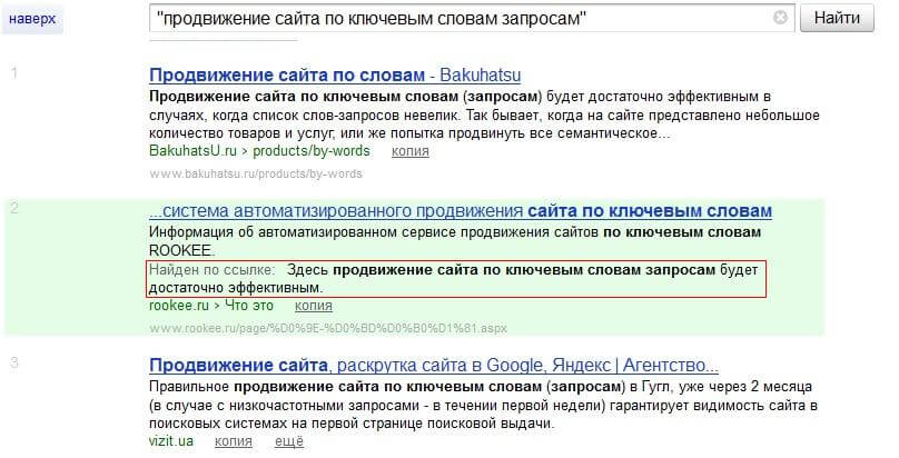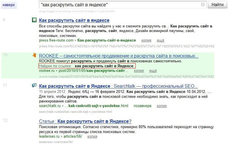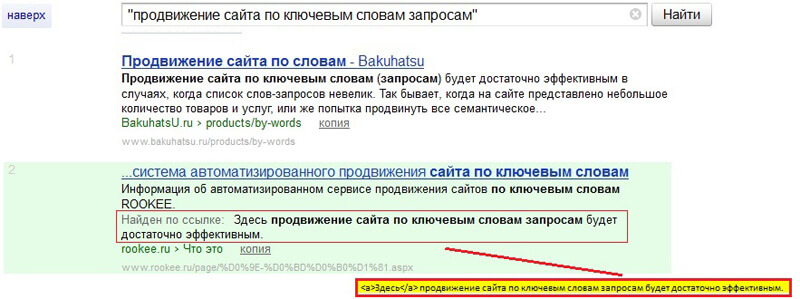 В ходе исследования было выявлено, что тексты у безанкорных ссылок одинаково хорошо работают – как справа, так и слева от ссылки. Так, например, для запроса “как раскрутить сайт в яндексе” в выдаче появился НПС («найден по ссылке»), где окружающий текст находился слева от ссылки.